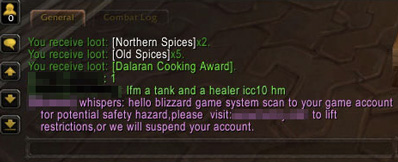 The in-game chat/whisper system is often used to lure players to phishing sites. The phishers usually pose as Blizzard employees or unknown players and "whisper" to the victim that they have been selected for receiving a free gift or that their account has been flagged as hazardous: